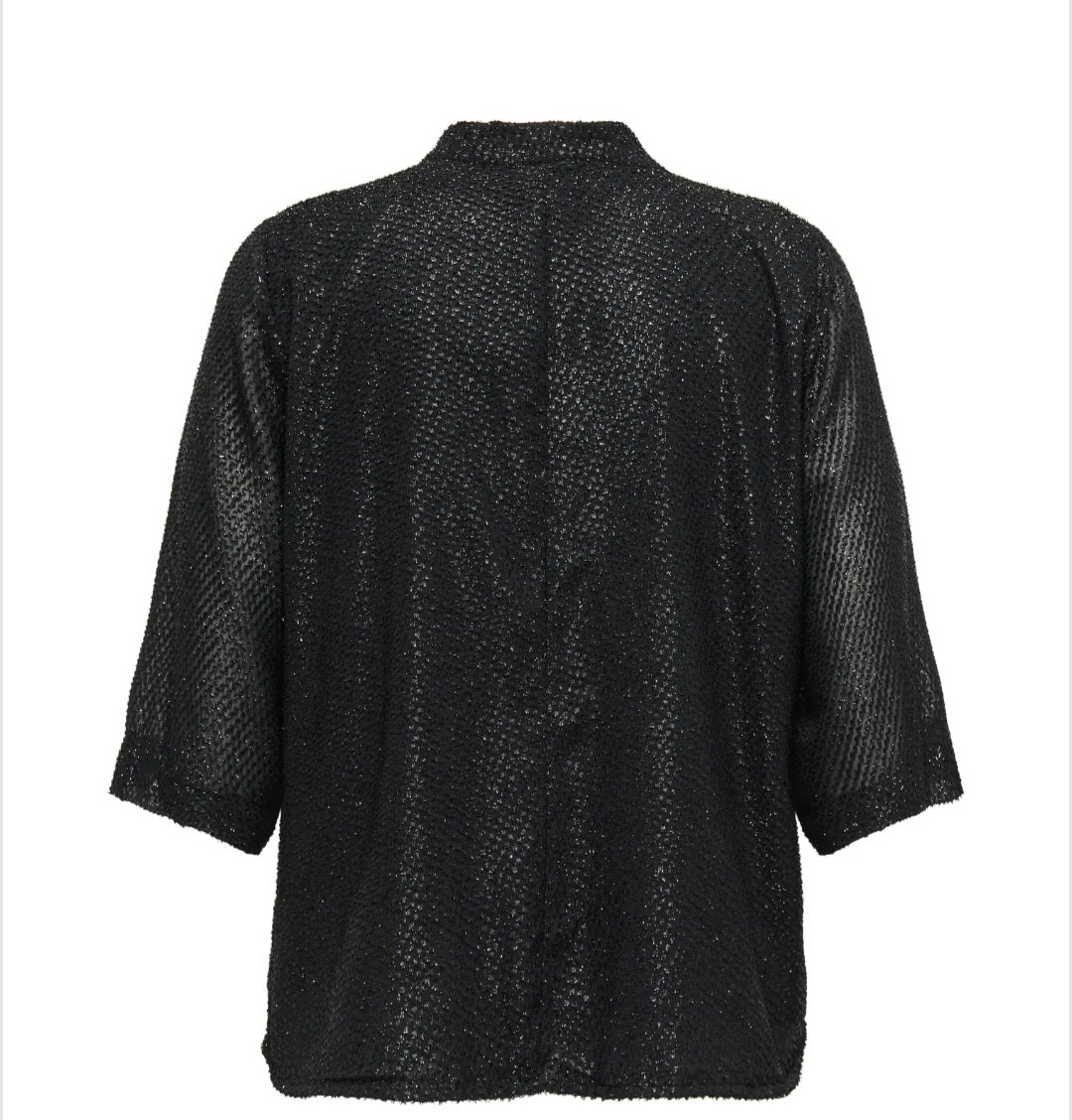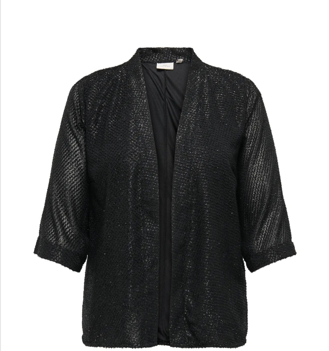 This versatile Only Carmakoma black Glitzy Kimono has a collar and is edge to edge ,has 3/4 wide sleeves , plain Bottom hemline , easy to dress up or down