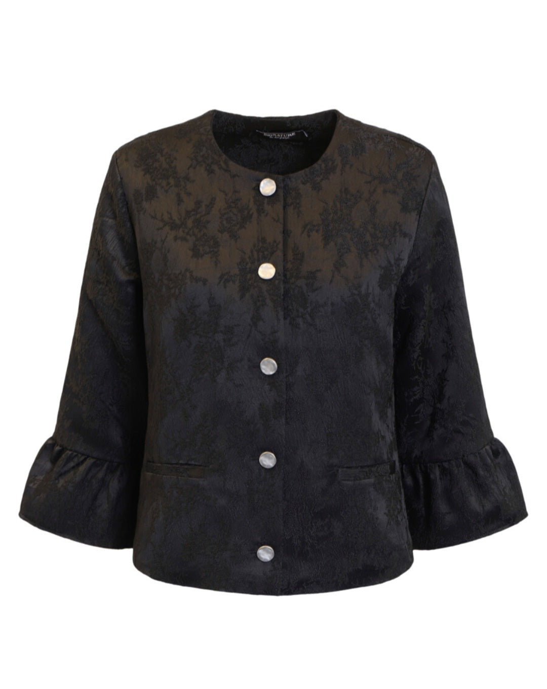 This wonderful Signature abstract floral embossed jacket has a round Neckline with 3/4 sleeves with extra large cuffs on the bottom of the sleeves,fastening with silver buttons, elegant style jacket that can be dressed up for any occasion