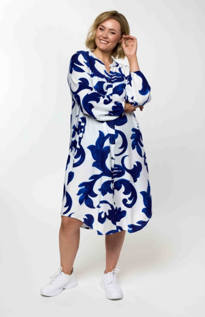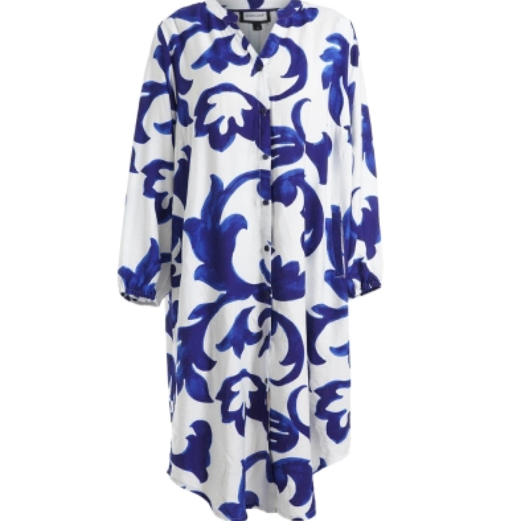 The Gozzip Ganja blue pattern Dress designed with a blue decorative print and a comfort relaxed fit ,the dress has a slightly A line shape hem and long sleeves which gives a elegant look and makes the dress suitable for any occasion  has a V neckline,long sleeves , has 2 Front pockets, button fastening from the V neckline to the bottom hemline