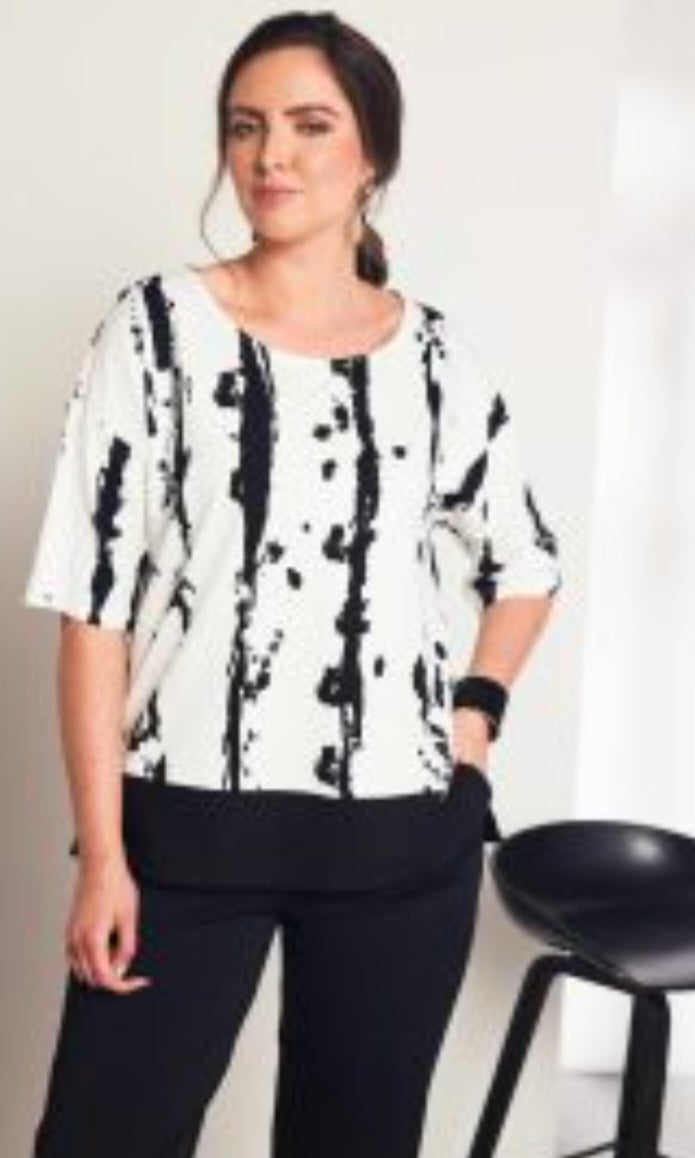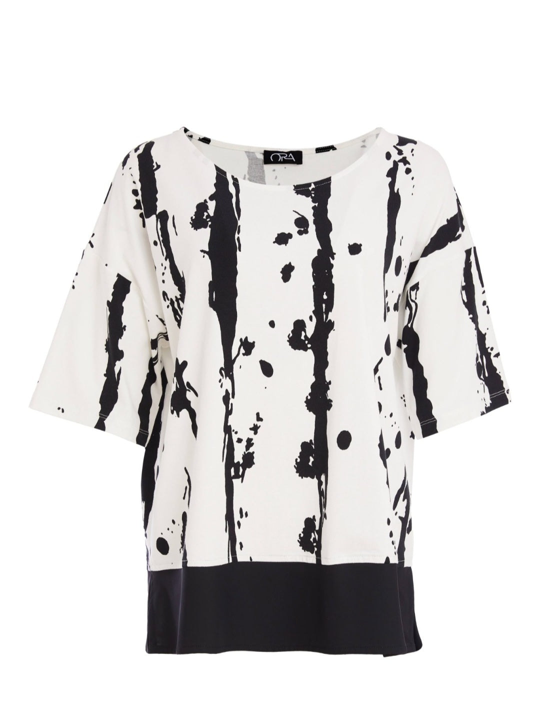 Ora introduce a short sleeved ,round neck top in a popular off white and black graphic print, the print runs vertically drawing the eye down and is boost by a solid panel of black that trims the hemline of the top