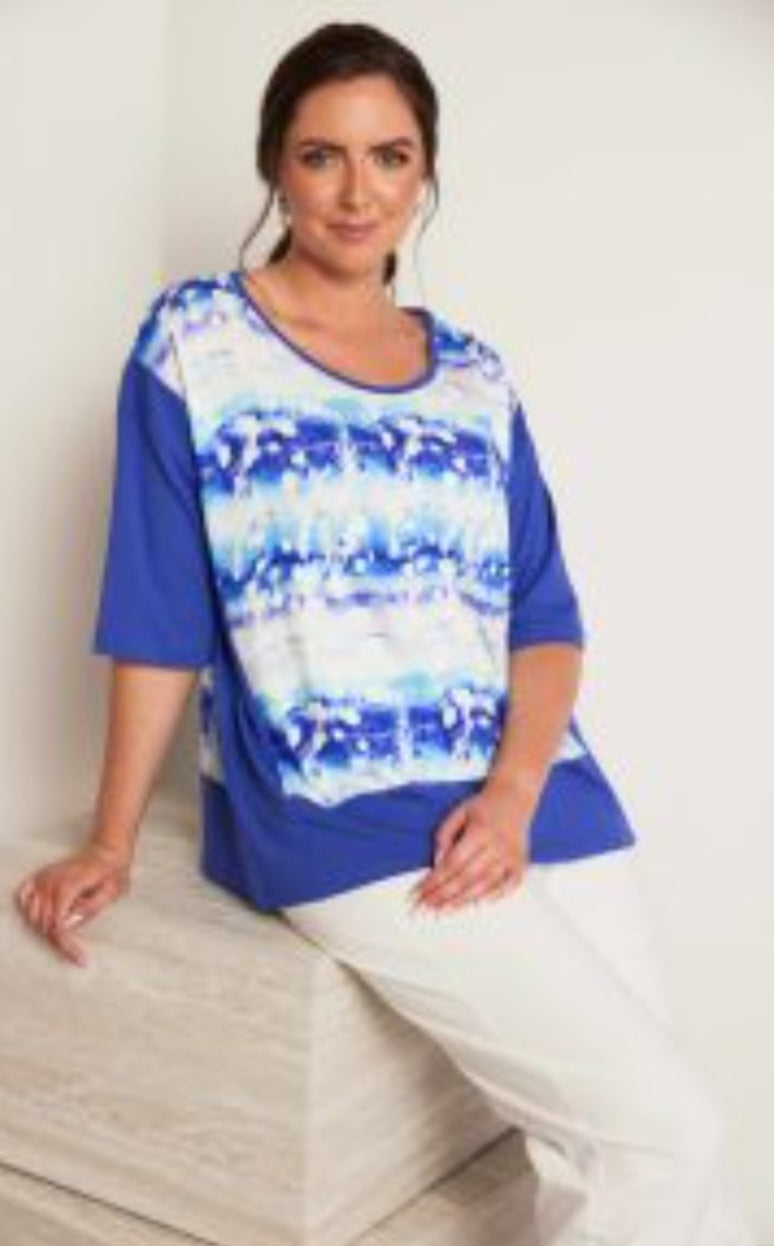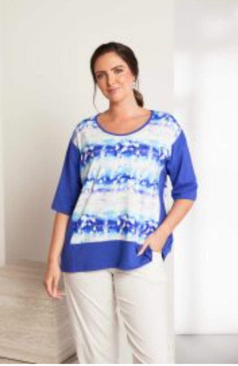 It's not Summer without a beautiful print top from the Ora brand, the classic cut round Neckline and short sleeves has been layered with a water -like abstract print focused on the front and back centre panels only , just enough print to tease