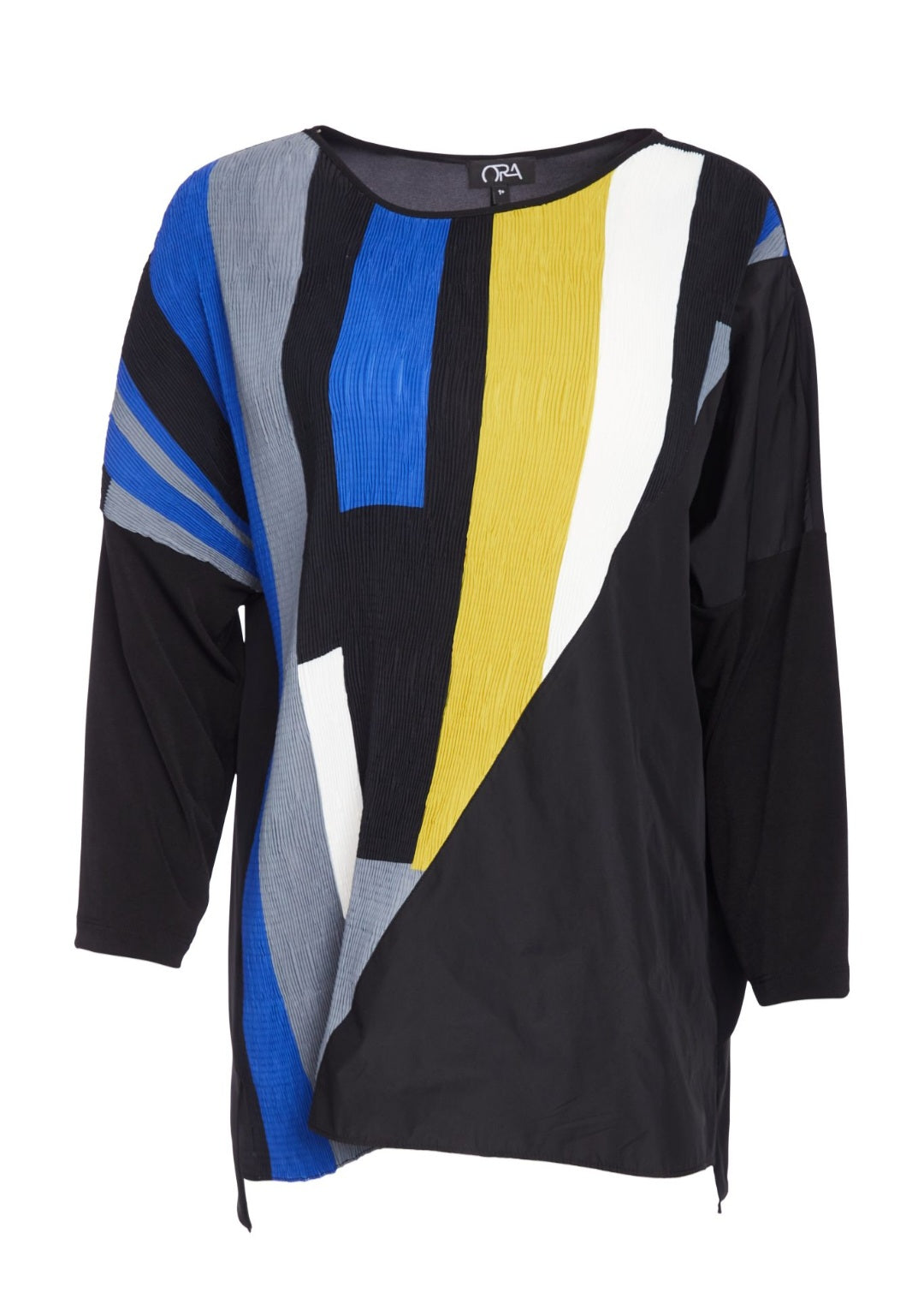This Ora Crinkle colour block top has the electricity colour mix is placed in a considered manner from the Neckline to the bottom hemline on a diagonal path .Allowing the wearer to express joy through the design