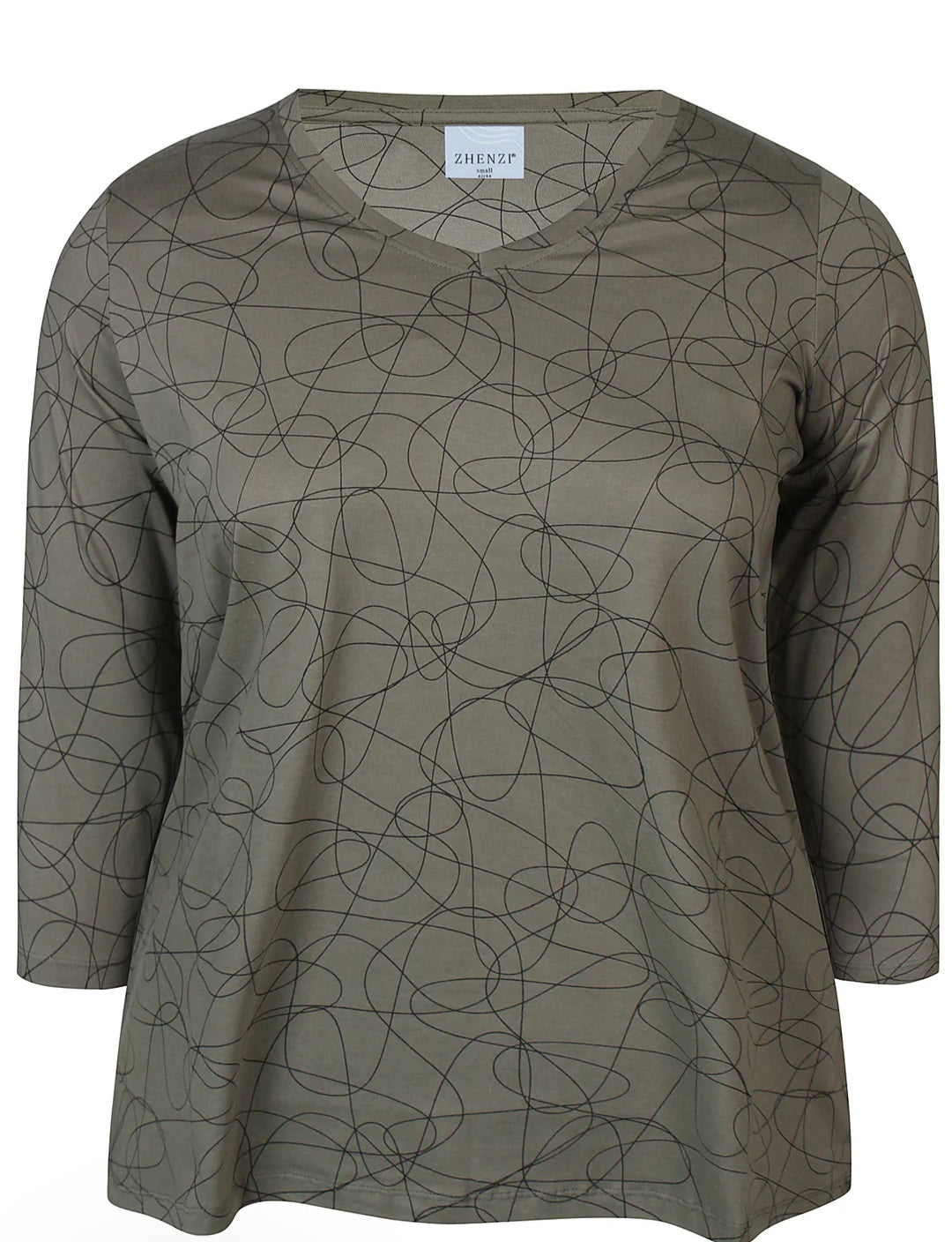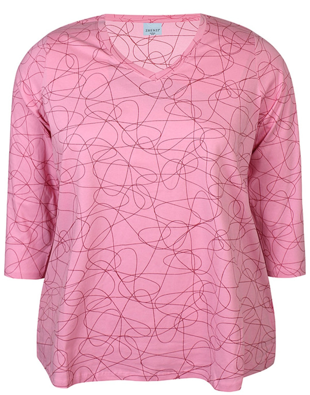 This Zhenzi soft and stylish T- shirt made from 100% breathable cotton .the graphic all over print adds a modern and personal touch , While the feminine V Neckline and 3/4 length sleeves make it a versatile choice for every day